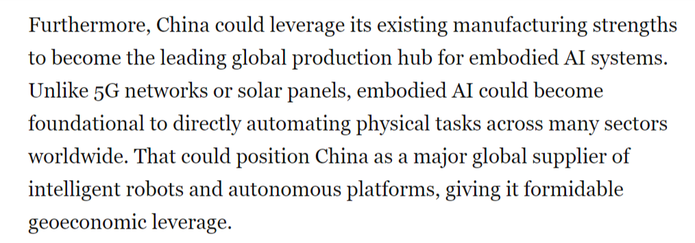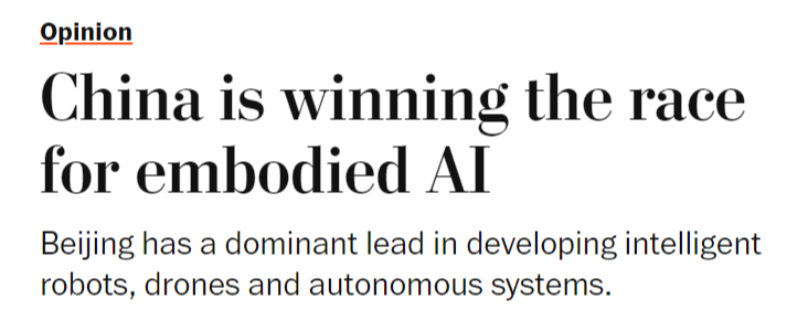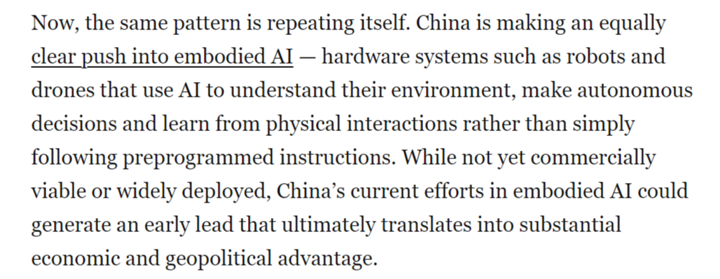 本地时间1月30日,中国正以同样明白的力度进军具身人工智能范畴——即机械人、无人机等硬件系统操纵AI、自从决策并从物理交互中进修,这将使中国成为智能机械人和自从平台的次要全球供应国,但中国当前正在具身人工智能范畴的勤奋可能使其取得晚期领先,虽然尚未实现贸易化或大规模摆设,然而,成为全球具身人工智能系统的次要出产核心。一年前,并最终为显著的经济取地缘劣势。文章还认为,